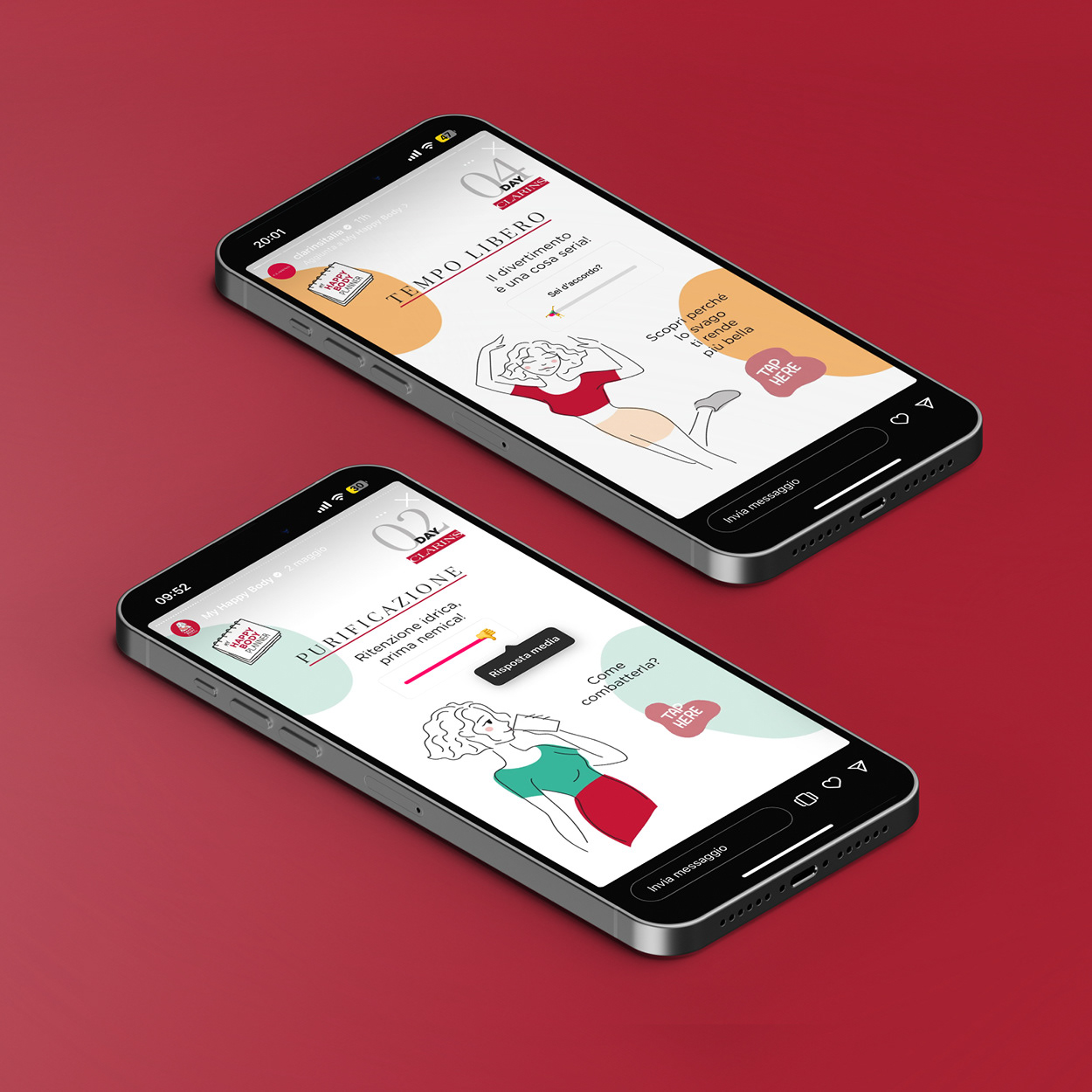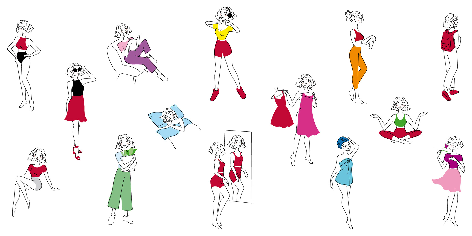 Illustrations for a kit that promotes inner and outer beauty by giving wellness tips for each day of the calendar. Illustrations inside the kit and for the social campaign.