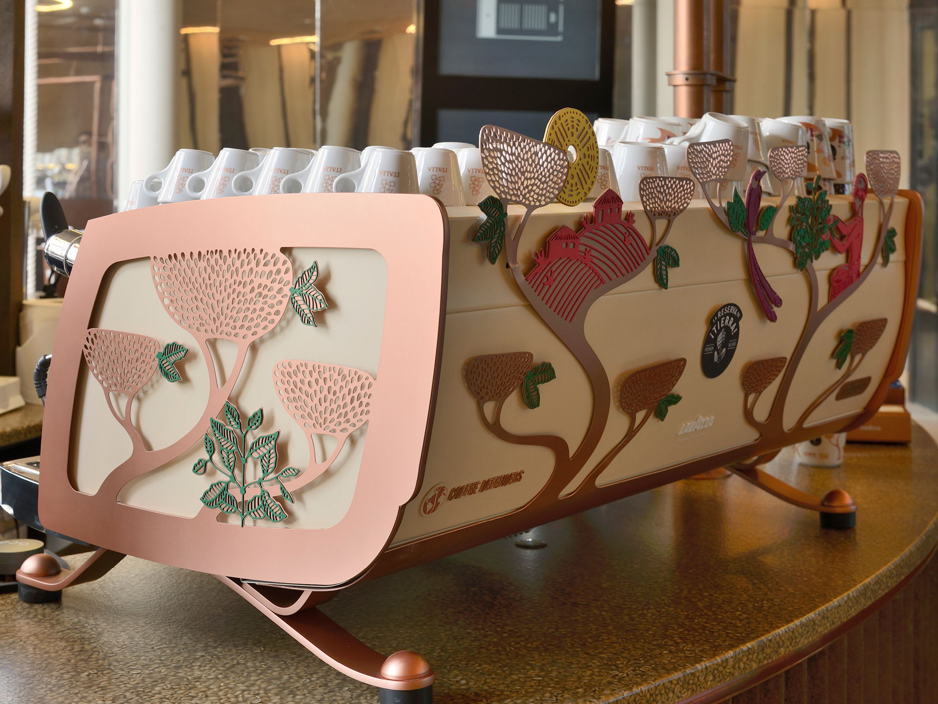 Customisation of the coffee machine and grinders introduced at the Italian Pavilion, Expo Dubai 2020, plus other elements of communication for Reserva de Tierra.