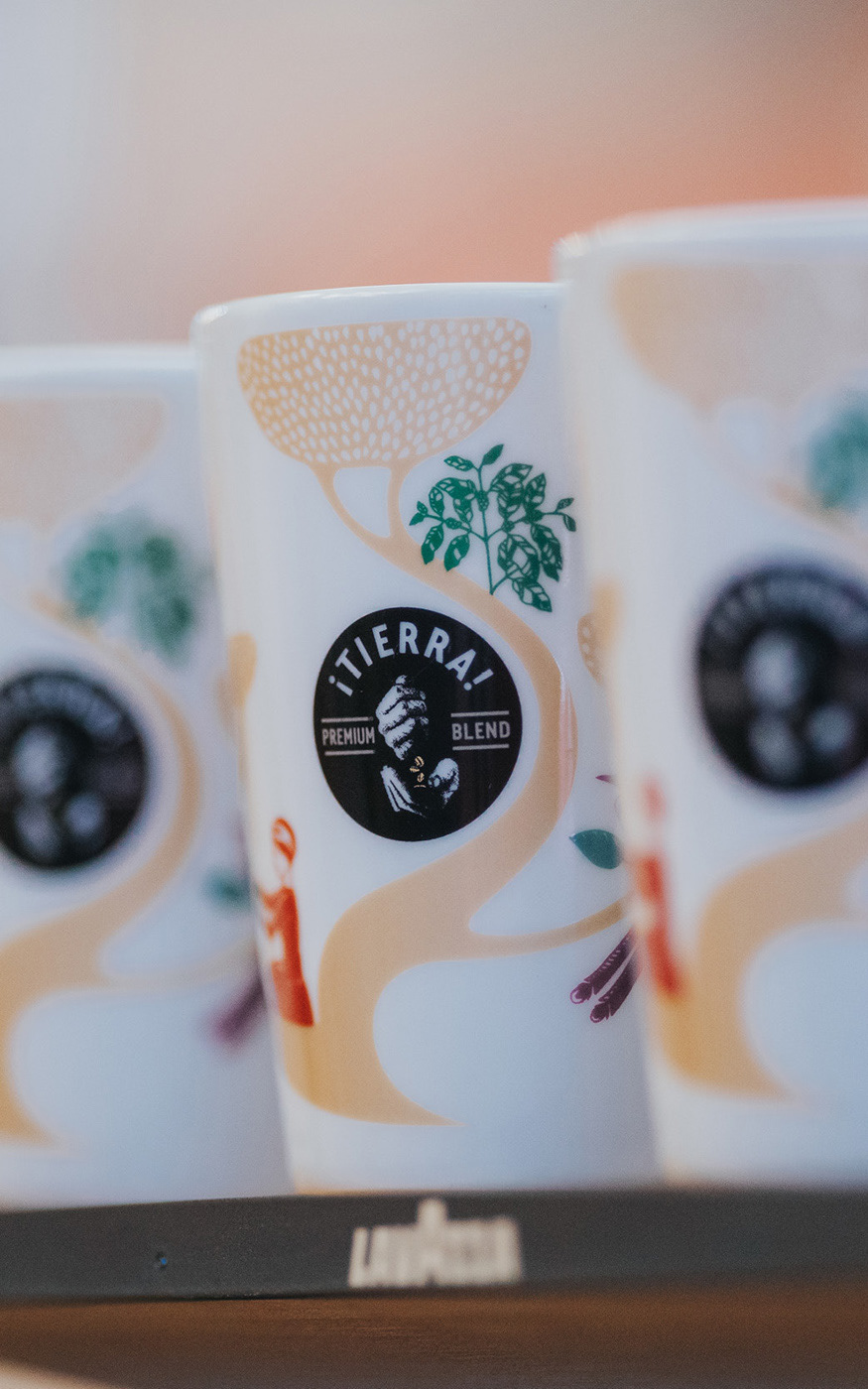 Design and illustrations for different elements of communication for Tierra Stand at World of Coffee exhibition in Berlin.
